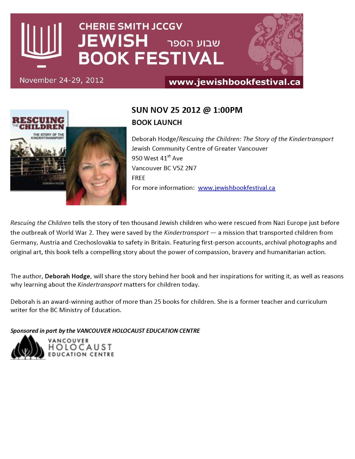 I’m pleased to announce that the Jewish Book Festival in Vancouver has invited me to be part of their program this year. I will be speaking about my new book: Rescuing the Children: The Story of the Kindertransport.